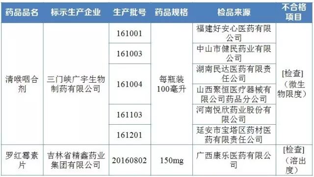 不合格产品的标示生产企业、药品品名和生产批号为:三门峡广宇生物制药有限公司生产的批号为161001、161003、161004、161103、161201的清喉咽合剂,吉林省精鑫药业集团有限公司生产的批号为20160802的罗红霉素片。不合格项目包括微生物限度、溶出度。