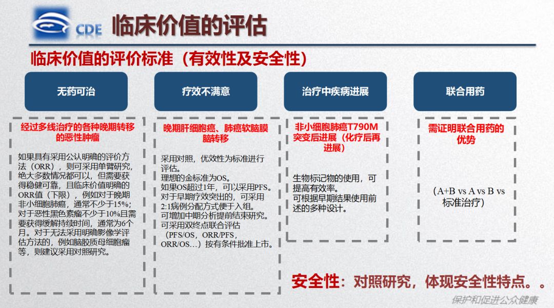 对比现有药物研发更好的新药,CDE审评标准要求采用对照,优效性为标准进行有效性评估。理想的金标准为OS。如果OS超过1年,可以采用PFS。对于早期疗效突出的,可采用2:1病例分配方式便于入组。可增加中期分析提前结束研究。可采用双终点联合评估(PFS/OS,ORR/PFS,ORR/OS等)按有条件批准上市。