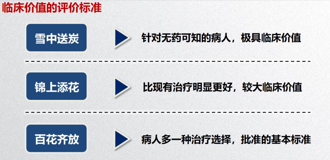 第二类,锦上添花型。比现有临床用药效果明显更好,比如,一些新的肺癌药物,有很显著的优势,这类的药物同样具有较大的临床价值。