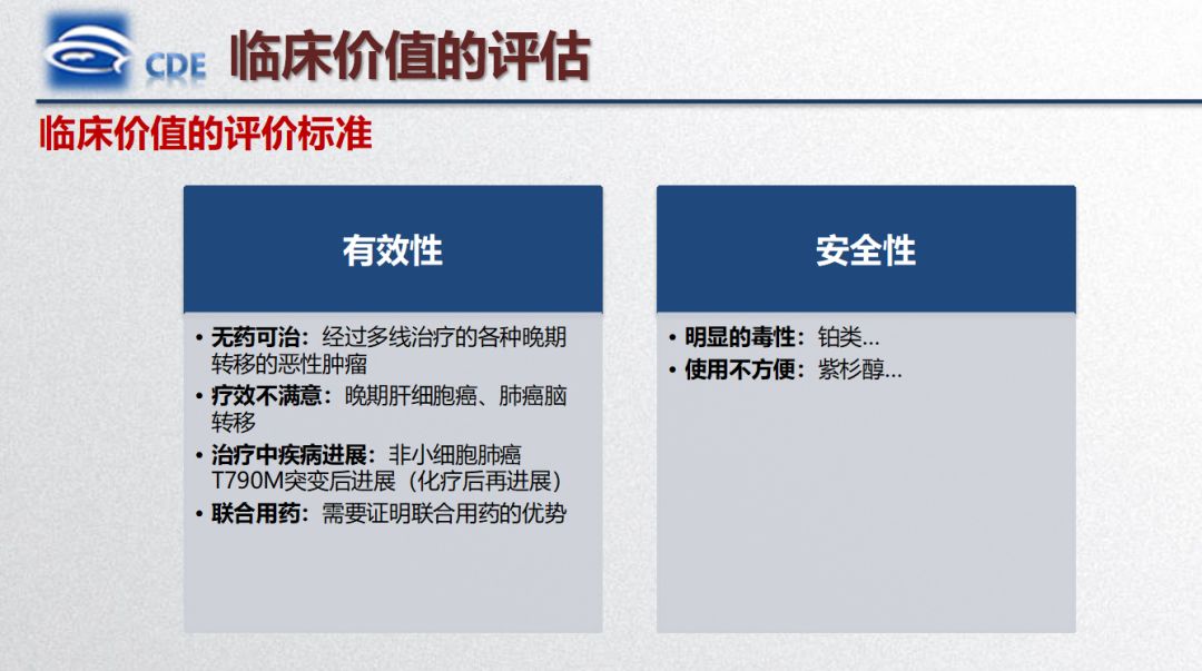 第一类,雪中送炭型。现阶段临床上无药或接近无药,总生存期(OS)很短,这一类新药极具临床价值。目前部分肿瘤药临床终点无进展生存期(PFS)仅延长几个月,并没有OS或其他非常好的获益,但患者除此以外并无其他选择, 故通过了CDE的审批。