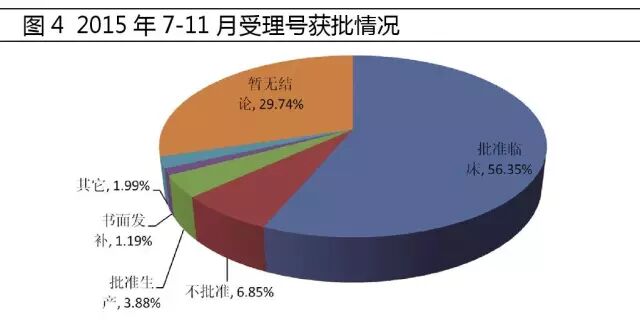 获批临床受理号最多从获批情况来看,2015年7-11月审结的受理号中获批临床的受理号占比最多,达56.35%。 其次是不批准的受理号,有6.85%。而获批生产受理号则有3.88%。