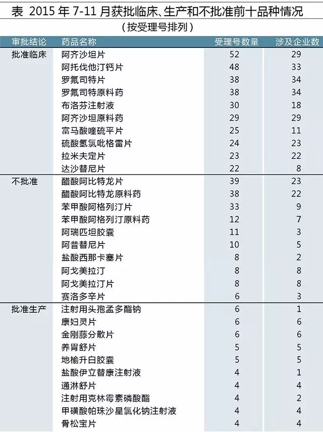 7-11月受理号审结最多的前十品种获批临床的前十品种主要以化学药为主,其中以阿齐沙坦片的受理号最多,所涉及的企业有29家。其次是阿托伐他汀钙片,所涉及的企业有33家。而不批准的品种中以醋酸阿比特龙片最多,涉及企业23家,其次是醋酸阿比特龙的原料药。获批生产的前十品种中以注射用头孢孟多酯钠的受理号最多。值得注意的是,获批生产的前十品种中,有6个品种是中药。