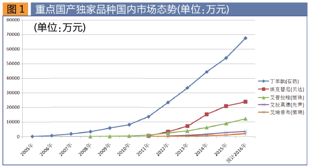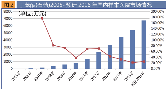 据国内样本医院数据统计,2005-2009年,丁苯酞市场一直处于低迷状态,国内样本医院丁苯酞用药金额基本维持在200万~600万元之间,五年来一直未突破千万元大关。2010-2016年,恩必普市场呈快速上升态势,连续六年呈现高增长态势,销售额从2005年的159万元增长至预计2016年的6.8亿元,其中,丁苯酞胶囊剂销售额为4.4亿元,丁苯酞注射剂销售额为2.4亿元。