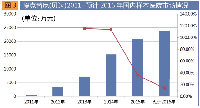 据国内样本医院数据统计,从2011-预计2016年销售趋势来看,埃克替尼连续4年呈现高增长态势。2011年销售额为484万元;2014年销售额为1.5亿元;2015年销售额为2.1亿元,较同期增长36.2%。预计2016销售额为2.4亿元,较同期增长14.4%。最近五年,埃克替尼抢占市场速度惊人,已成为国产小分子靶向药物市场新的亮点,但预计2016年市场有所放缓。