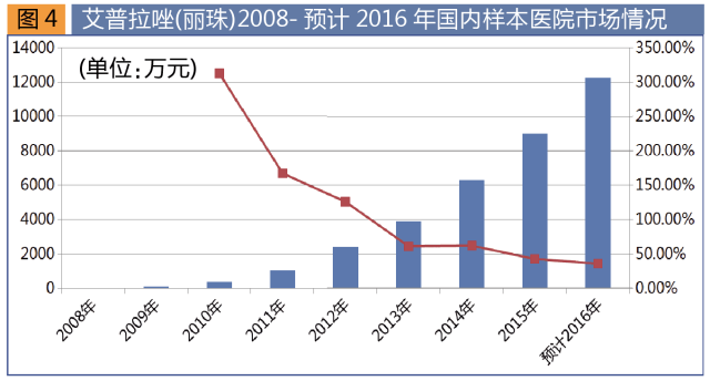 据样本医院数据统计,2008年艾普拉唑销售额为87万元,2015年销售额高达9020万元,同比增长42.9%,增速较快,预计2016年销售额为1.2亿元,较同比增长36.1%。近几年艾普拉唑市场爆发式增长,增长势头不可小觑。