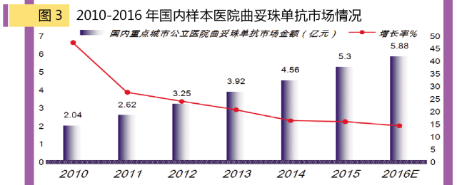 据HDM系统数据,2016年1-3季度国内重点城市公立医院赫赛汀用药金额为4.41亿元,预测2016年我国重点城市公立医院赫赛汀用药金额达5.88亿元,同比上一年增长了14.41%。国内市场规模为16.33亿元。