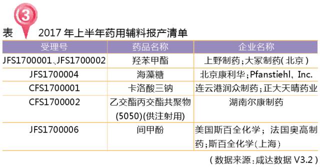 药用辅料报产有新的受理号模式,进口的前三位字母为“JFS”,国产的前三位字母为“CFS”,2017年上半年共5个药用辅料报产。