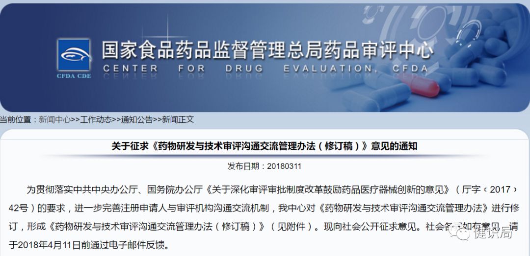 快看!CDE改革新药审评审批流程,特设这个环节…今天(3月11日),国家食品药品监督管理总局药品审评中心(简称“CDE”)对《药物研发与技术审评沟通交流管理办法》进行修订,形成《药物研发与技术审评沟通交流管理办法(修订稿)》(见附件)。现向社会公开征求意见。社会各界如有意见,请于2018年4月11日前通过电子邮件反馈。