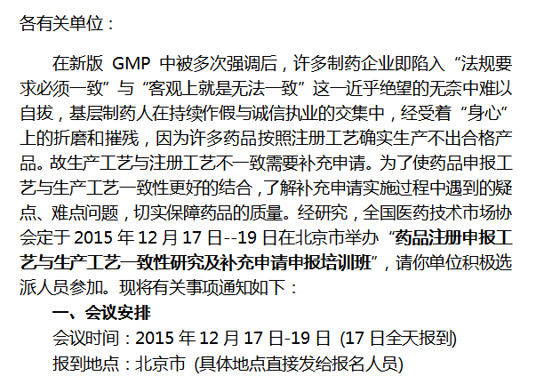 文件下载》关于举办“药品注册申报工艺与生产工艺一致性研究及 补充申请申报”培训班的通知